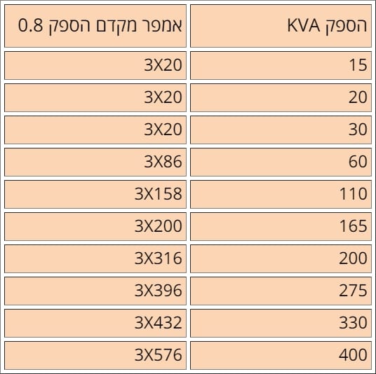 זרם (A) מקסימאלי לפי גודל גנרטור