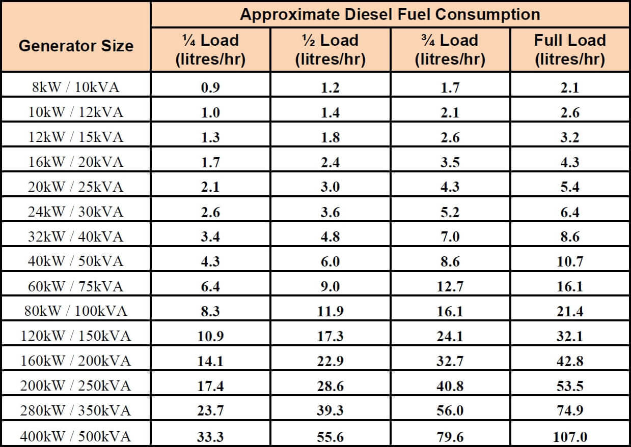 טבלת צריכת סולר לגנרטורים, הספק חשמלי וזרם מקסימלי